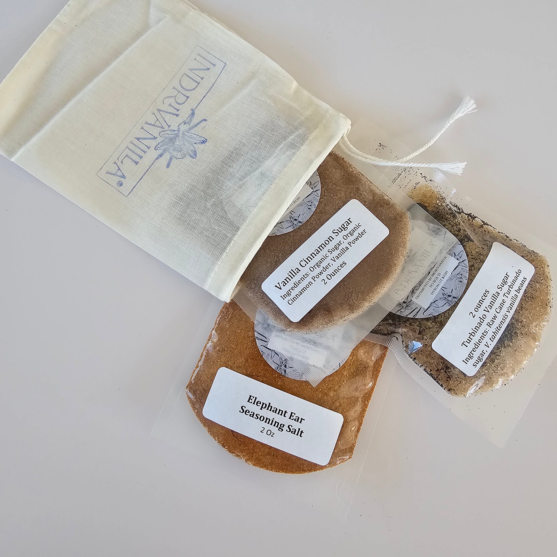 We've been doing this for several years now and we can attest--vanilla makes EVERYTHING better. Now, you can bless your tastebuds at every meal with a sprinkle of amazing, vanilla-enriched flavor! The Sugar & Spice Sampler Trio includes three unique products, all made in-house, in small batches with the finest ingredients including vanilla, to maximize flavor and freshness. Each package will contain two ounces of the following spice or sugar blends, and are sealed in re-closable, bpa-free pouches for safe storage and ease of use. They come in a cute muslin bag for adorable gifting, or travel so you can take your vanilla with you anywhere you go!