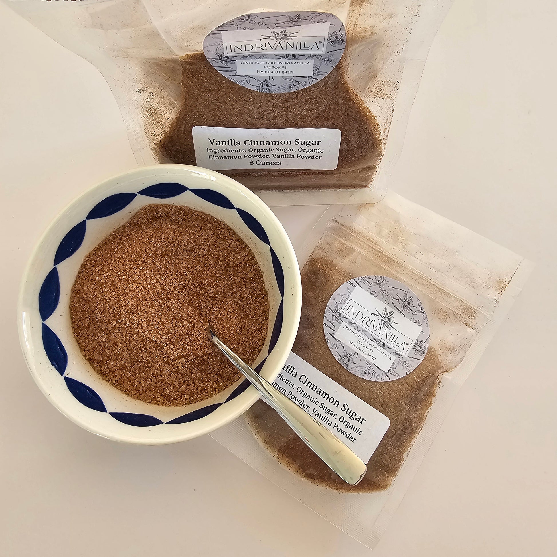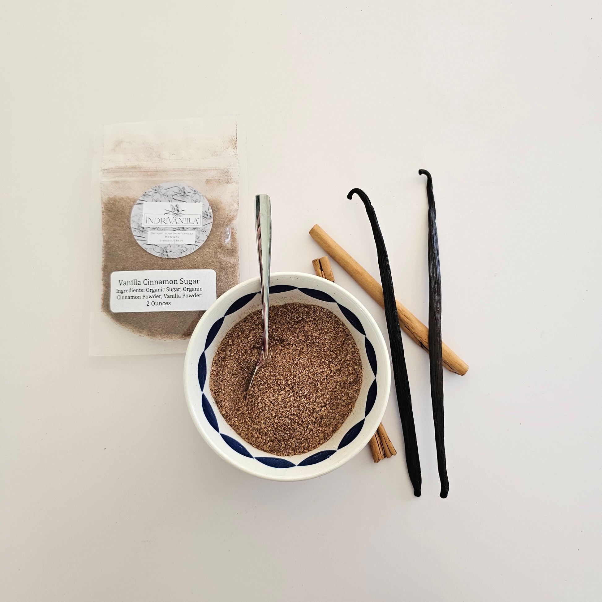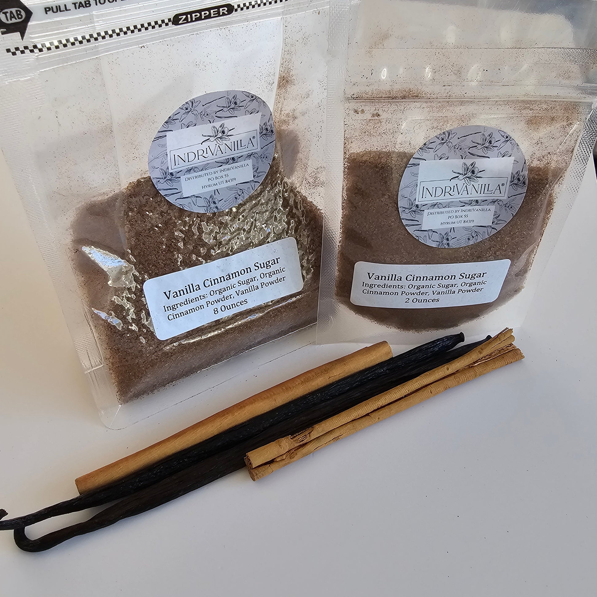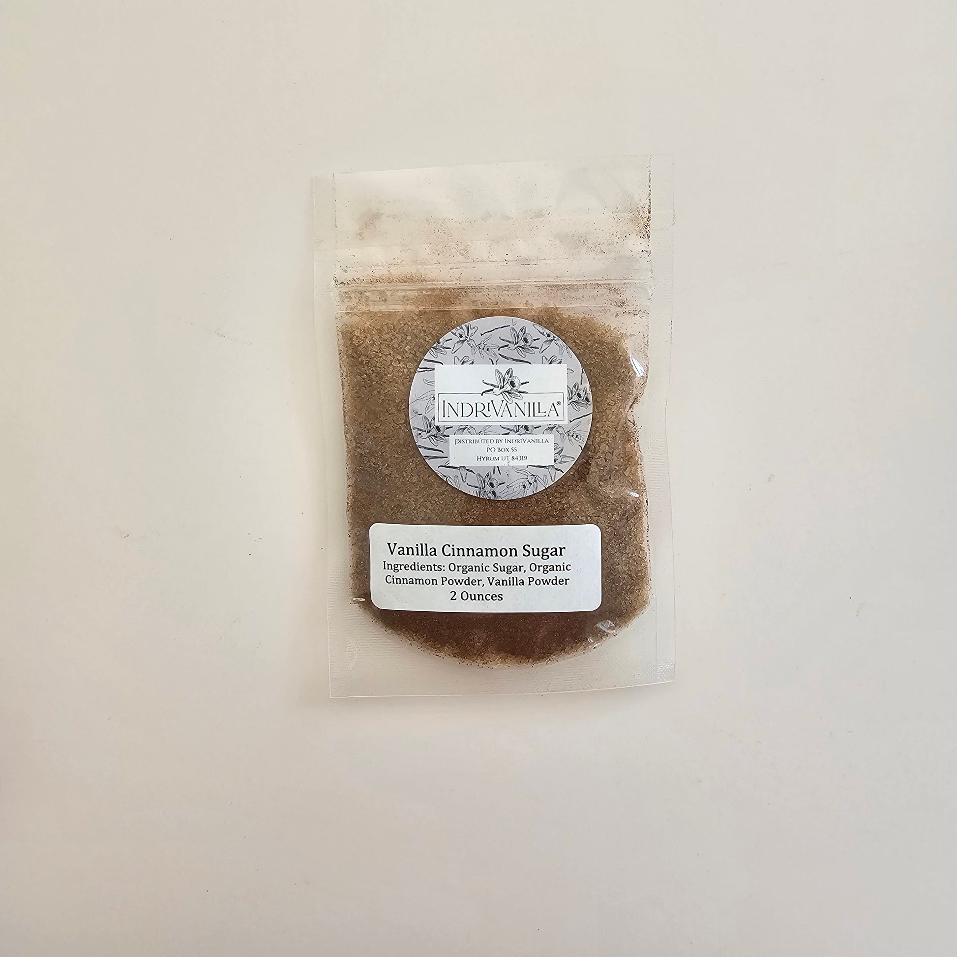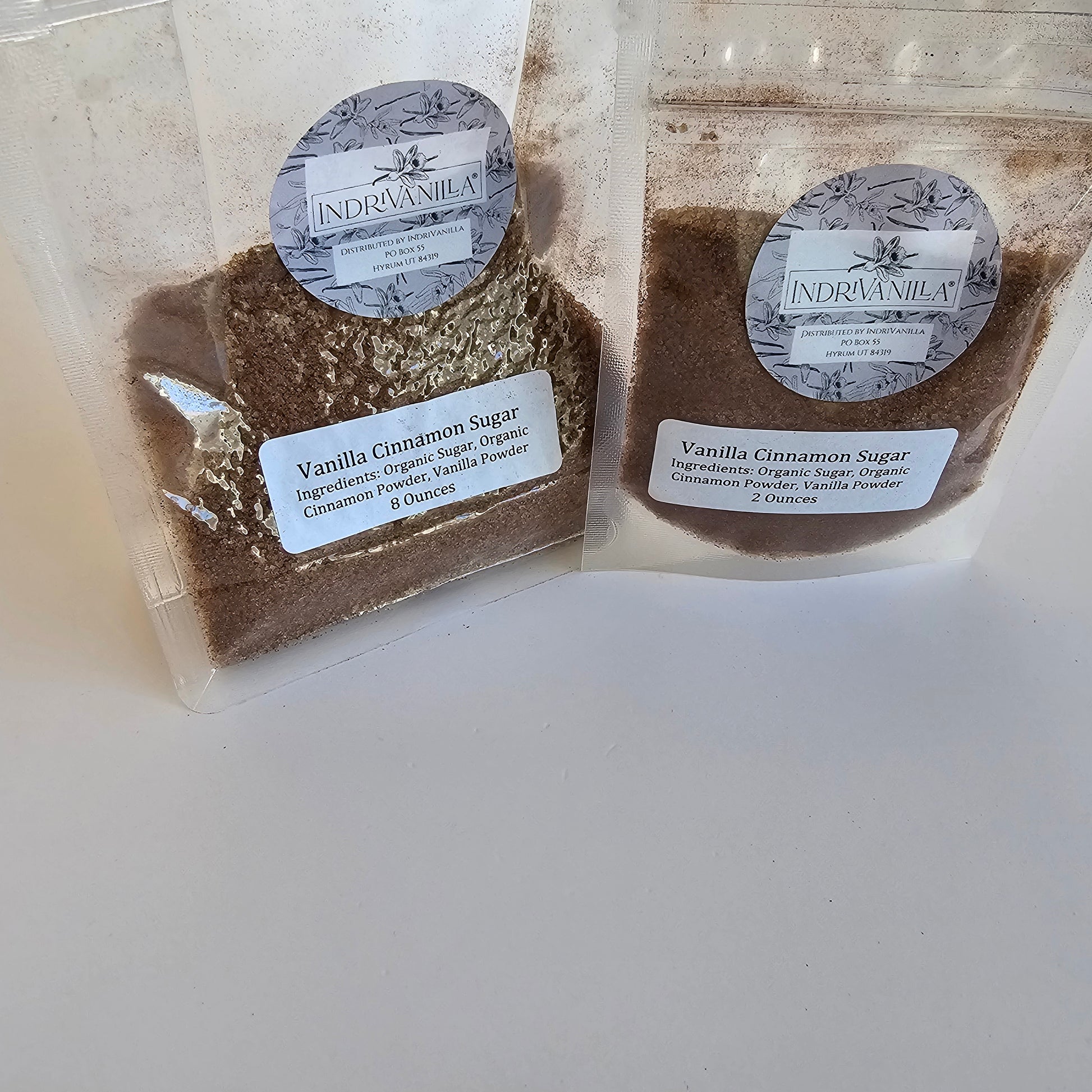 Ingredients: Organic Cane Sugar, Ceylon Cinnamon, Vanilla Powder. Shipped in food safe, resealable plastic bags. Net Weight 8 oz or 2 oz, depending on which size you purchase. Contains: Cinnamon